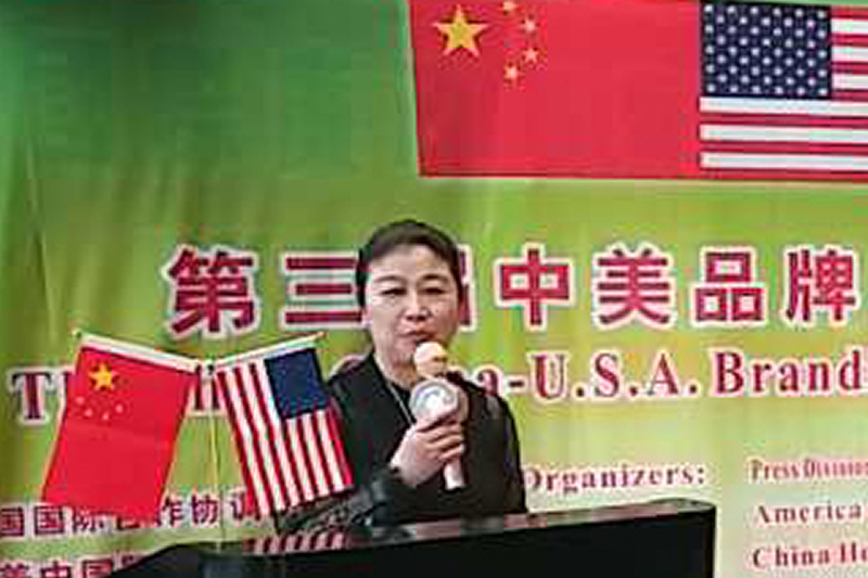联合国国际外交关系人权和平委员会副主席兼常务副秘书长Derek Dizhi Huang在第三届中美品牌战略论坛上为北京祥瑞万方影视文化传媒有限公司董事长刘春梅颁发“世界知名品牌奖”