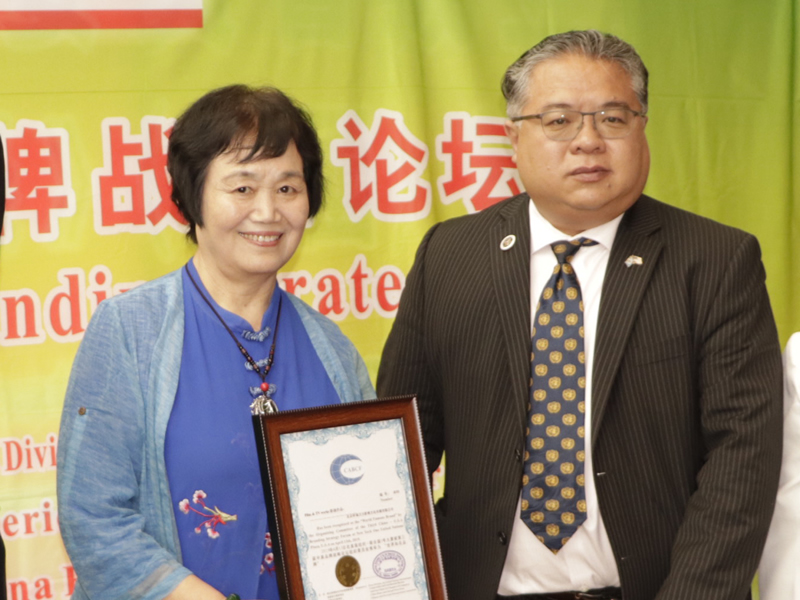 联合国国际外交关系人权和平委员会副主席兼常务副秘书长Derek Dizhi Huang在第三届中美品牌战略论坛上为美国联合总商会会长Nancy颁发“世界知名品牌奖”