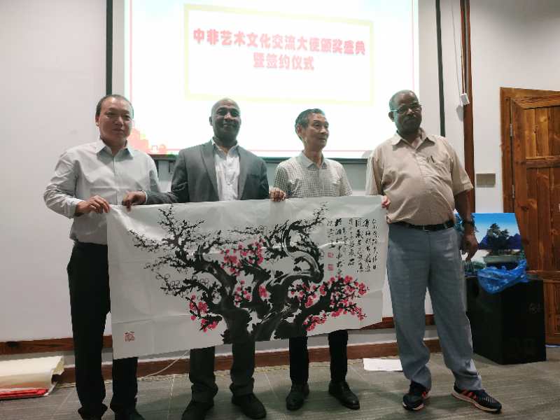 众所周知,非洲国家的人民能歌善舞热情奔放,而中国也是一个源远流长文化底蕴深厚的国家,交流会上非洲友人表演了本民族特色节目;还有中国古琴加茶艺表演曲目(中国古琴表演+非洲姑娘茶艺表演,并由非洲国家文旅部部长Doreen Silver Katusime开罄);郭兰英弟子周京霞老师表演了越剧独唱;艺术家现场挥毫展示国画作品。湖南人民对外友好协会代表王宗兰女士携非洲国家文旅部部长Doreen Silver Katusime、及乌干达湖南商会会长龙志伟先生、湖南歪果仁文化传播有限公司王森波董事长给各位艺术家颁发收藏证书和荣誉证书。