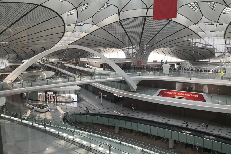 跟随王强,记者们搭乘扶梯到达B1层,这里设置了上百台值机区,方便乘坐不同交通工具的旅客值机;抵达4层,便可看到全球最大规模的单体航站楼。