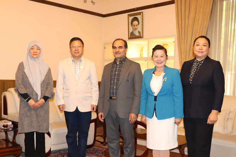 中外新闻社总编辑韦燕、副总编辑刘登臣、首都师范大学《教育艺术》杂志社常务副社长刘桂英同伊朗驻华大使馆新任文化参赞阿巴斯阿里•瓦法伊及文化专员马晓燕在一起