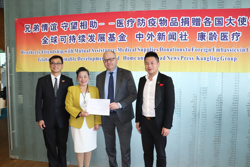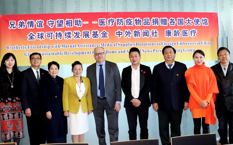 冰岛共和国驻华大使古士贤(Mr.Gunnar Snorri Gunnarsson)同中外新闻社总裁韦燕、副总裁张珈闻、全球可持续发展基金执行主席章起华出席医疗防疫物品捐赠仪式