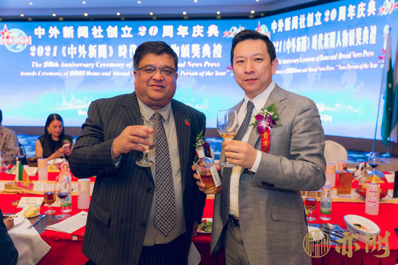 斯里兰卡驻华大使帕利塔•科霍纳阁下(H.E.Mr.Mahbub Uz Zaman)同深圳大鲸酒业董事长冯源欢聚在中外新闻社创建20周年庆典会上