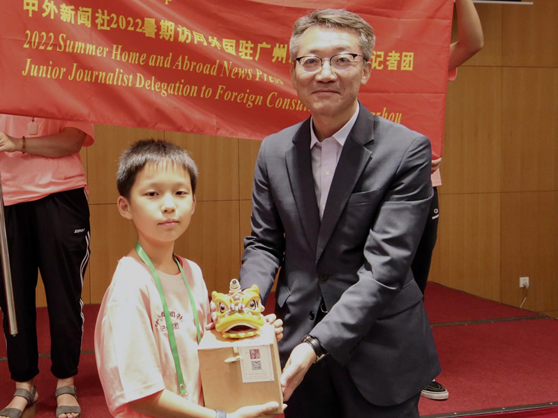 Consul General Han Jae Heuk said “Thank you very much for your question. I just like a curious junior journalist like you. There are 21 prefecture-level cities in Guangdong province, and I have visited most of them. Guangdong is a very important province in China with rich cultural heritage. 2022 marks the 30th anniversary of the establishment of diplomatic relations between China and ROK, and it will rely on Guangzhou, this international city, to promote talent education with information technology, and lay a solid foundation for the development of China- ROK educational cooperation.
