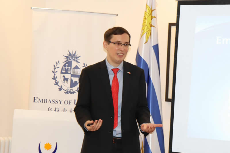 When entering the Uruguayan Embassy in China, the two sides of the main hall are hung with various Chinese-style collections and Uruguayan artworks, ethnic silver jewelries, terracotta warriors, bronzes, porcelains and such. Counselor Gonzalo firstly gave a welcome speech, and then played a promotional video about Uruguay to the junior journalists.
