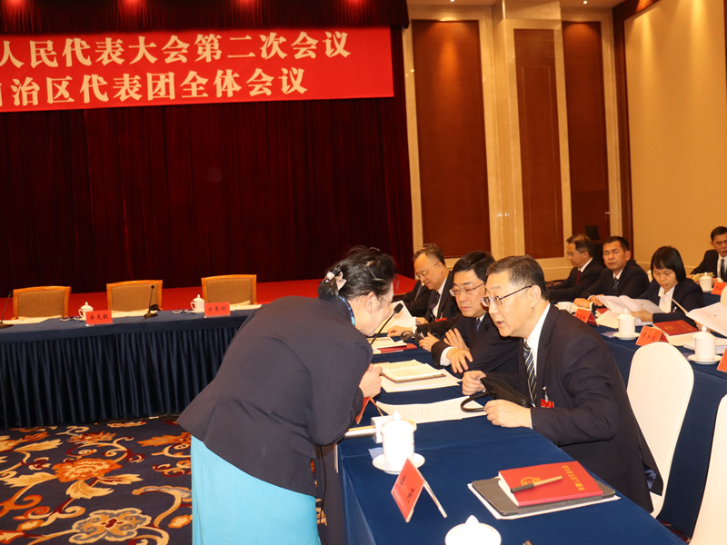 3月6日下午,十四届全国人大二次会议广西代表团在驻地召开第五次全体会议,并举行开放团组活动,向境内外记者开放
