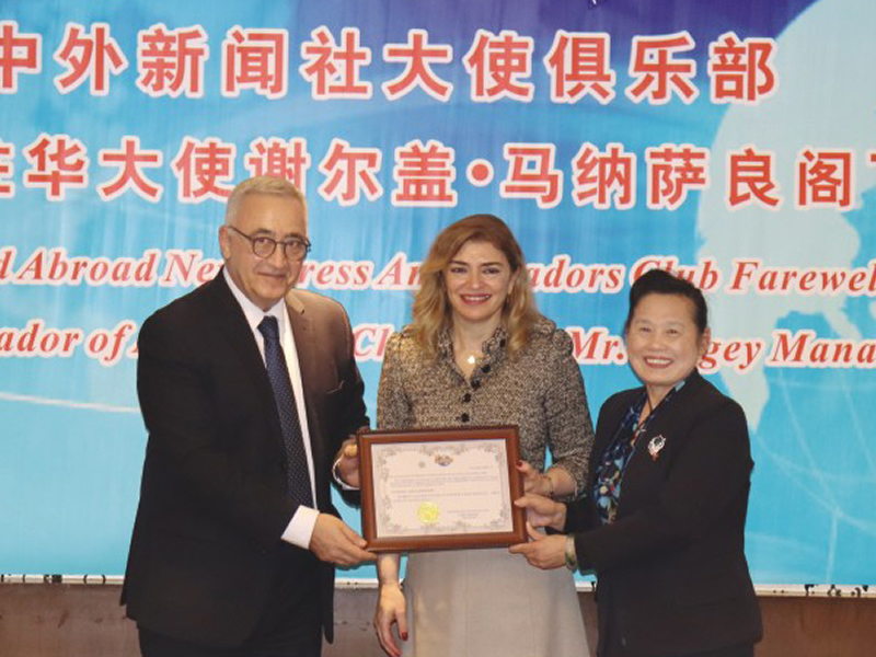 谢尔盖大使和韦燕总裁给黎巴嫩驻华大使米莉亚•贾布尔阁下(H.E. Ms. Milia Jabbour)颁发中外新闻大使俱乐部任职证书