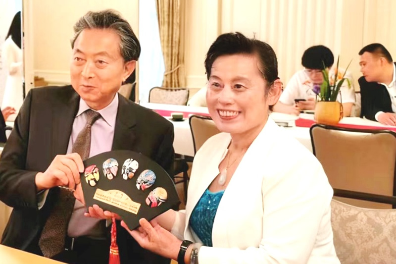 韦燕在鸠山由纪夫位于东京的事务所里,同鸠山由纪夫展示中国文化