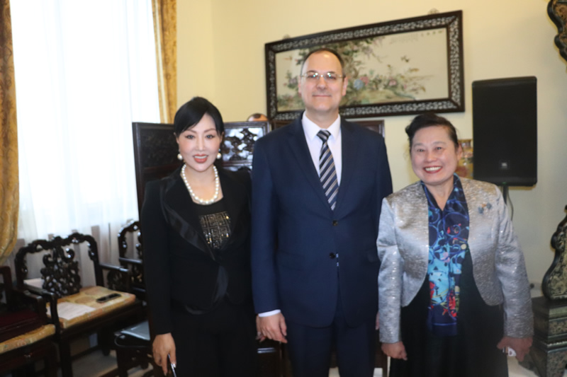 俄罗斯驻华临时代办谢尔盖·克拉明采夫同中外新闻社总裁韦燕、国际文化部副部长乌仁友好交流