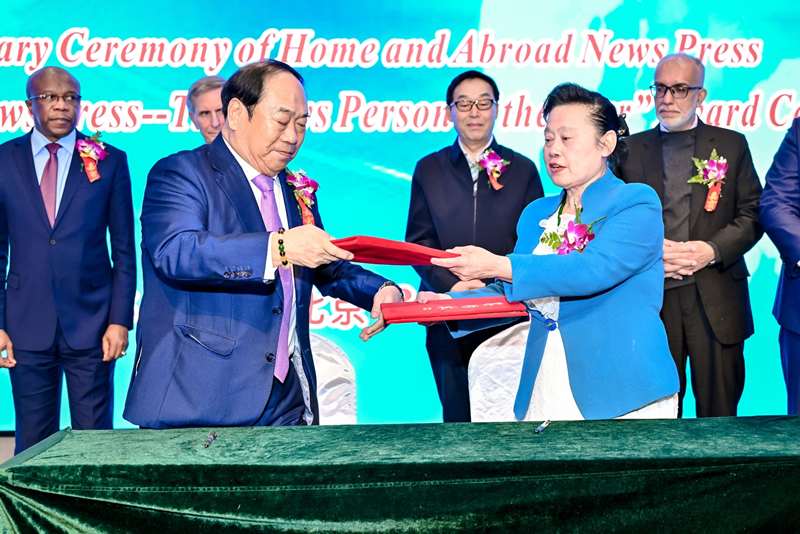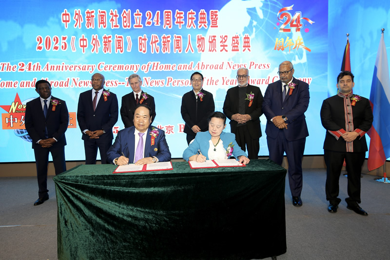 On December 22, at the 24th Anniversary Ceremony of Home and Abroad News Press and 2025 “The News Person of the Year” Awards Ceremony, President of Home and Abroad News Press Mrs. Wei Yan and Chairman of Beijing Star Brand Group - Grand Metropark Longxi Conference Center Beijing Mr. Gan Lianfang, signed an agreement to establish a permanent base of Home and Abroad News Press Ambassadors Club at Grand Metropark Longxi Conference Center Beijing. Ambassadors and diplomats from Bulgaria, Timor-Leste, Senegal, Cape Verde, Malawi and other countries witnessed the signing ceremony.