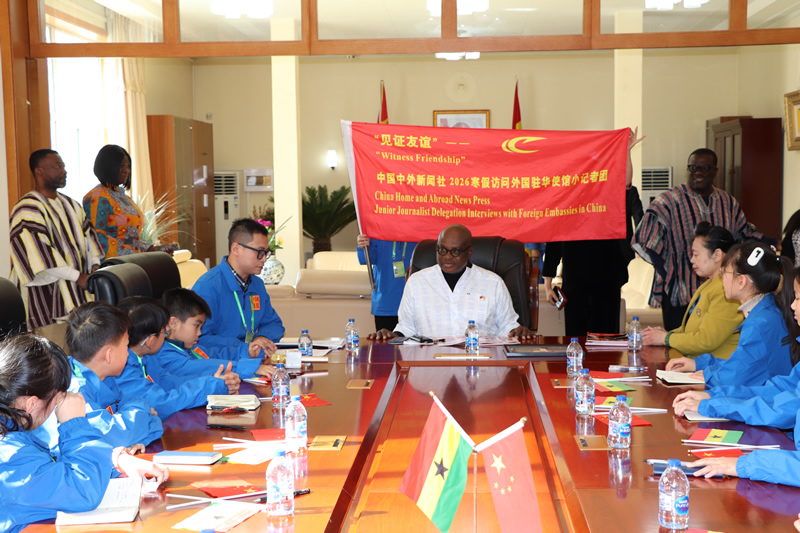 (中外新闻社小记者 杨语陶 李静娴 吴盈灿 桂海明 曲知临)加纳共和国位于非洲西部, 因盛产黄金, 独立前称“黄金海岸”。加纳被称为“可可之乡”, 据说全世界每6块巧克力中, 就有一块原料来自加纳。2月6日上午, “见证友谊”2026寒假中国中外新闻社小记者挥动中加两国国旗、列队进入加纳驻华大使馆, 采访加纳驻华大使科乔·邦苏阁下。