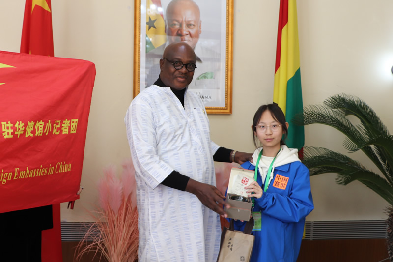 The junior journalists also exchanged views with the ambassador on topics concerning travel and study in Ghana. Through interviewing the Ghanaian Ambassador to China, the junior journalists not only gained a deeper understanding of Ghana but also experienced the ambassador's diplomatic charm and infectious warmth. At the conclusion of the interview, each junior journalist presented the ambassador with a gift of their own calligraphy or painting, wishing him happiness in his work and life in China.