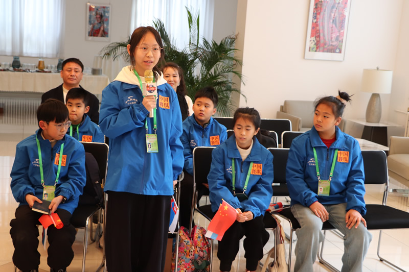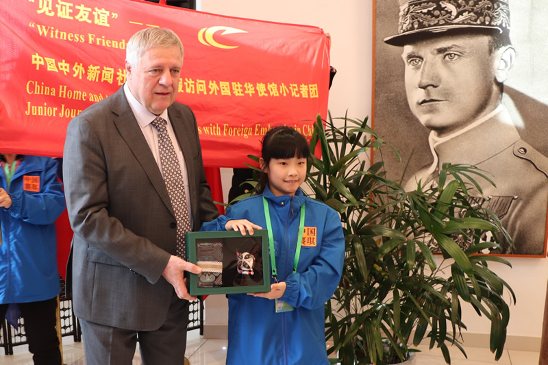After the interview concluded, Ambassador Leciak and Counsellor Ms. Lucia Skvareninova of the Slovak Embassy in China, invited the junior journalists to enjoy refreshments and juice. The junior journalists were delighted and presented the Ambassador with small gifts they had prepared. For a moment, the atmosphere of Slovak-Chinese friendship filled the Slovak Embassy. Everyone gathered for a group photo in front of the flags of the European Union, Slovakia, and China, cheering in unison: “China and Slovakia’s friendship go on forever!”