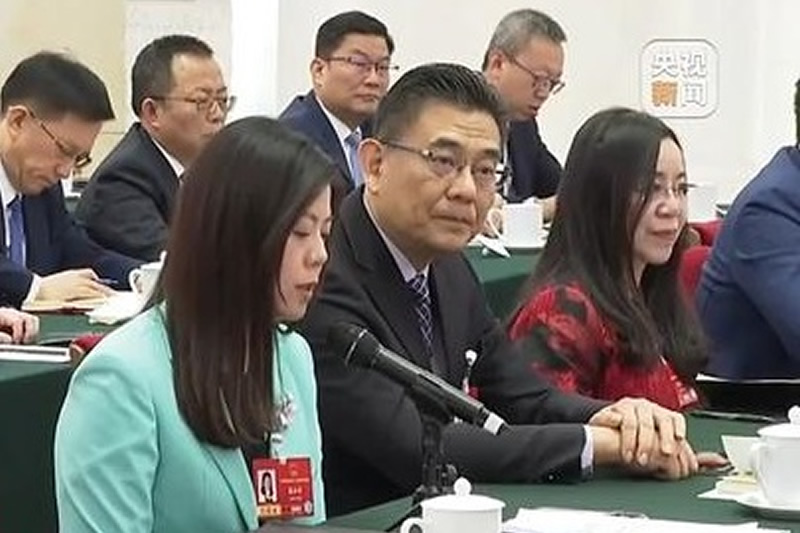 十四届全国人大四次会议香港代表团举行开放团组会议。图为全国人大代表马逢国发言