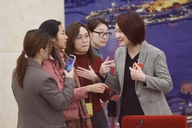 中外新闻社记者韦燕就生态环境法典草案的内容同陈晓峰代表友好交流