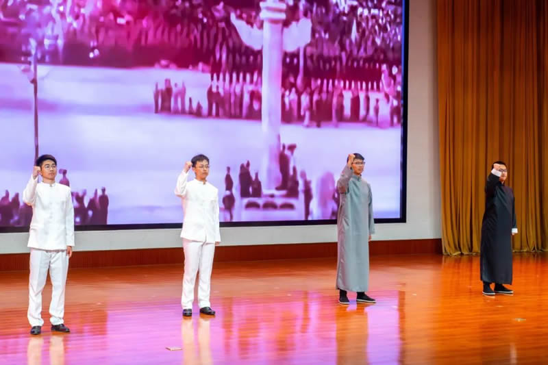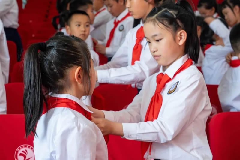 第三篇章通过微课《爱国志,党团队共传承》、歌伴舞《领航》、佩戴和授旗仪式等环节,展现红色基因代代传。活动在全场合唱《歌唱祖国》中圆满落幕 。