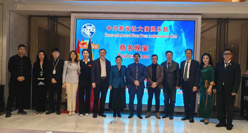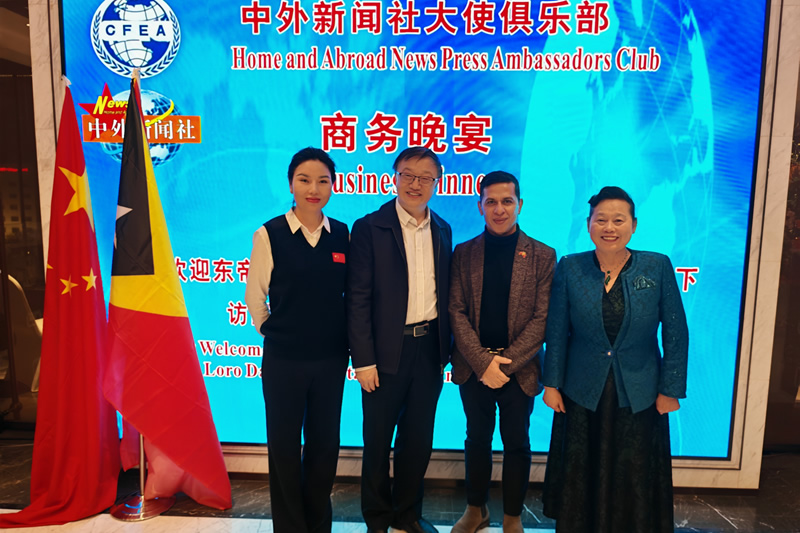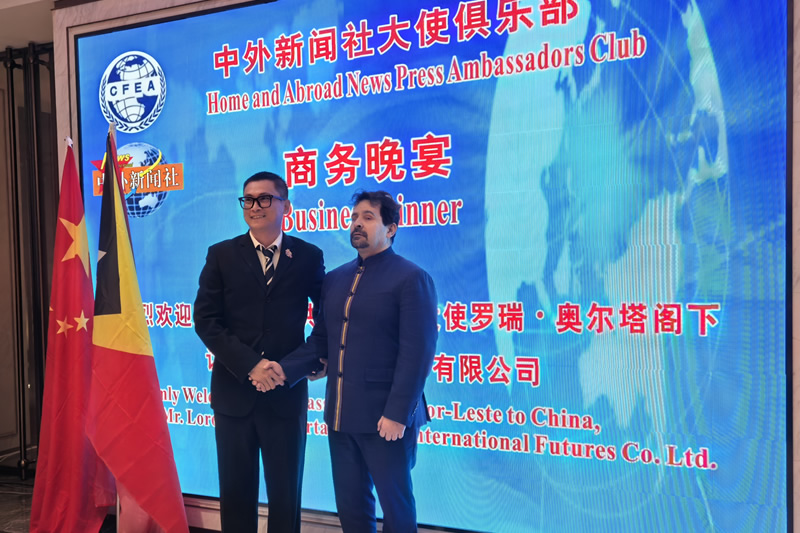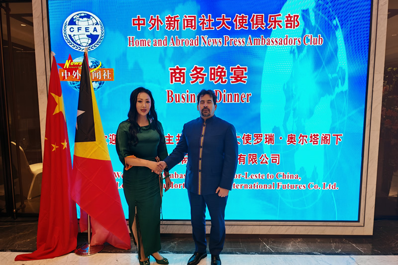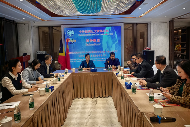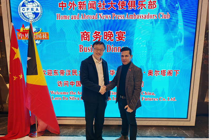 November 17, 2025, Home and Abroad News Press Ambassadors Club Business Dinner was held at the 16th floor ballroom of China International Futures Co. Ltd. in Beijing. Ambassador of Timor-Leste to China H.E. Mr. Loro Da Silva Horta and Commercial Attache Mr. Aires Aparicio Guterres attended the dinner, which was hosted by President of Home and Abroad News Press Ms. Wei Yan, CEO of China International Futures Co. Ltd. Mr. Jiang Xin, Executive Director Mr. Liu Dengchen, Vice President Ms. Chen Xi, Deputy Director of International Cultural Division Ms. Virginia and Vice President Mr. Alan Zhang. Before the business dinner, the two sides had friendly exchanges and in-depth discussions on cooperation opportunities.