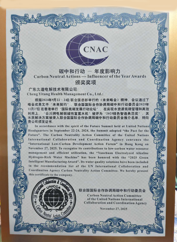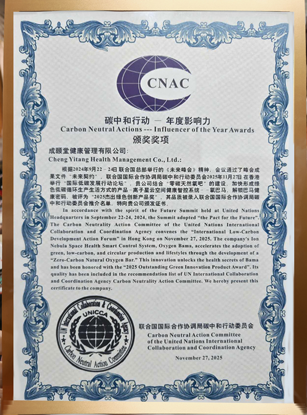 人类只有一个地球,各国应当齐心协力,精心呵护地球家园,共同推进全球治理。为此,中外企业家肩负着重要的历史使命,中外企业家联合会主席戴维▪萧先生在致辞中盛赞低碳绿色产品:由北京天九共享控股集团赋能的成颐堂健康管理有限公司--天然氧吧,结合“零碳天然氧吧”的建设,加快形成绿色低碳循环生产生活方式的产品-离子星云空间健康智控系统--氧巴马,解锁巴马健康密码,被评为“2025杰出绿色创新产品奖”。广东久道电解技术有限公司--云川牌电解弱碱性富氢水机,其水质解决方案被录入联合国国际合作协调局碳中和行动委员会推介名单。