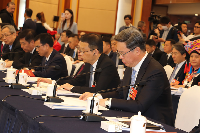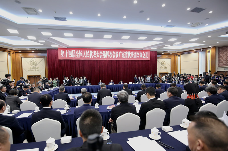十四届全国人大四次会议广东代表团在驻地举行全体会议,继续审议政府工作报告