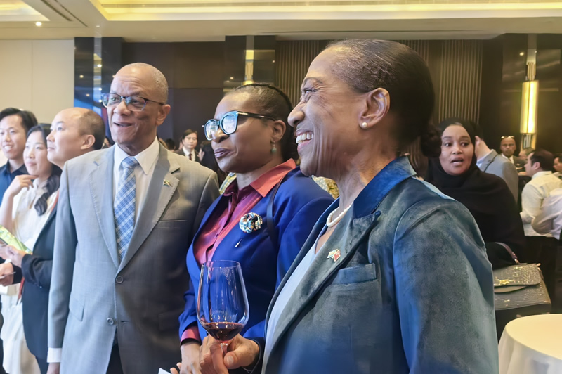 出席毛里求斯独立日和中毛建交54周年招待会的大使有: 斯里兰卡驻华大使马金达•贾升和阁下、马耳他驻华大使白瀚轩阁下、 巴基斯坦驻华大使哈什米阁下、格林纳达驻华大使马岩阁下、佛得角驻华大使阿林多·多罗萨里奥阁下、加纳驻华大使科乔·邦苏阁下、克罗地亚驻华大使达里欧·米海林阁下、肯尼亚驻华大使威利•贝特阁下、马拉维驻华大使艾伦约瑟夫·钦泰扎阁下、尼日尔驻华大使加尔巴·塞尼阁下、玻利维亚国驻华大使乌戈·西莱斯阁下、巴哈马驻华大使波莱特·贝瑟尔阁下、圭亚那驻华大使周雅欣阁下及俄罗斯、挪威、伊拉克、英国等近40多个国家驻华大使和使节, 招待会现场氛围热烈。在致辞环节后,共同举杯, 大家向毛里求斯国庆节致以美好祝福, 在场嘉宾一同举杯响应, 共贺这一重要时刻。随后, 毛里求斯驻华大使萧晓山阁下同中国政府非洲事务特别代表、中非合作论坛事务大使刘豫锡携手主桌嘉宾共同切开庆典蛋糕, 象征着毛里求斯的繁荣发展与中毛友谊的甜蜜绵长。
