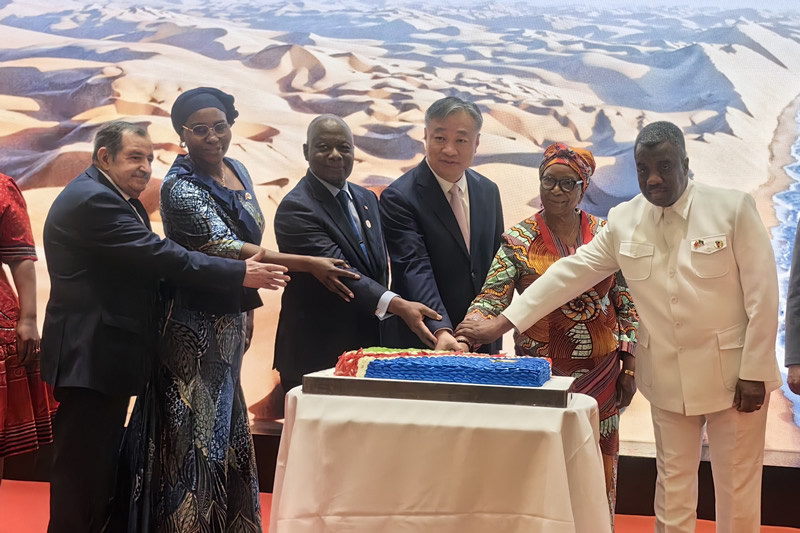 Following the speech, Ambassador Emwula and Vice Minister Miao Deyu raised their glasses in celebration with ambassadors from various countries present and jointly cut the birthday cake for Namibia.