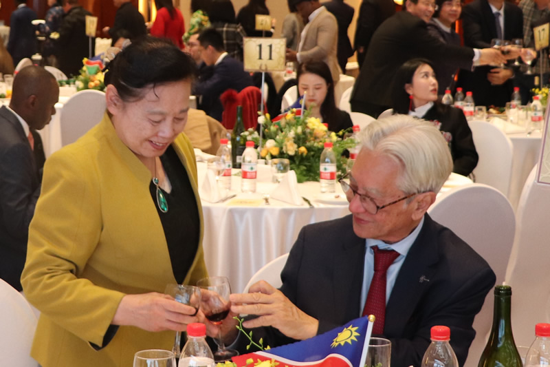 中华人民共和国外交部副部长苗得兩阁下同纳米比亚驻华大使托纳塔·埃姆武拉(H.E. Tonata Itenge-Emvula)举杯祝贺中纳友谊地久天长